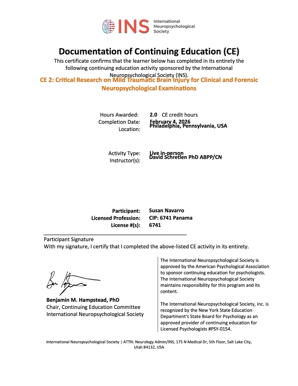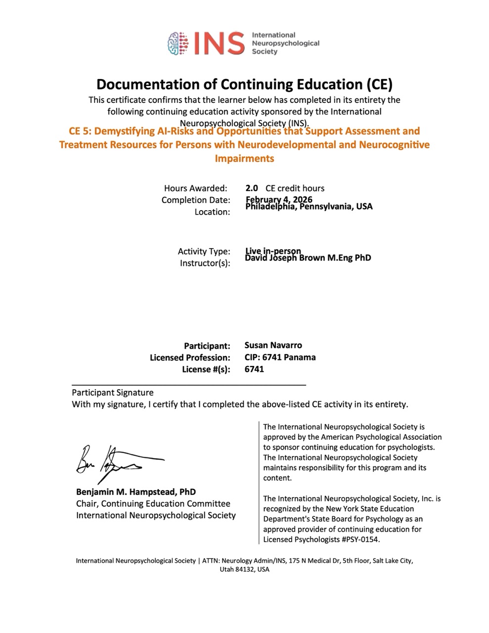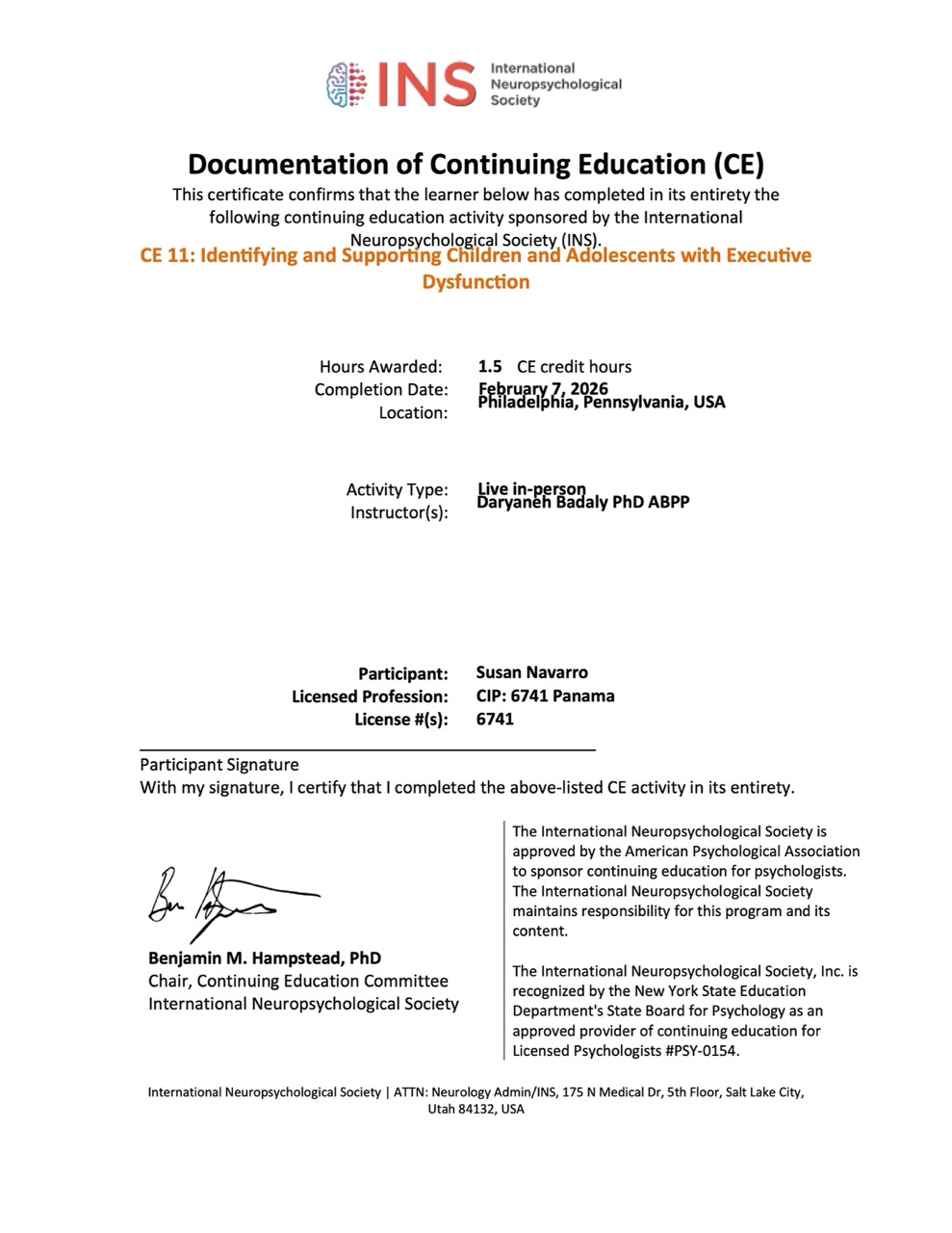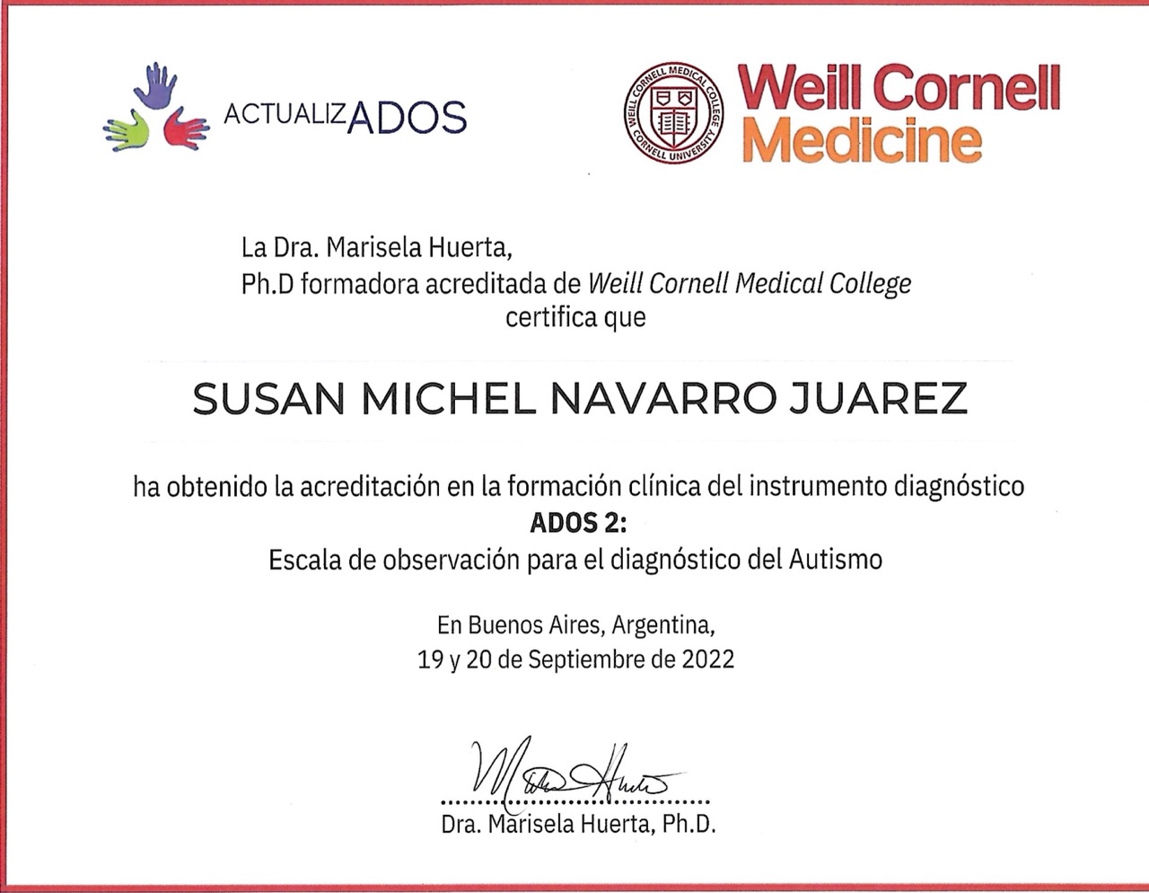 Certificación Clínica ADOS-2 (Escala de Observación para el Diagnóstico del Autismo): Weill Cornell Medicine, impartido por PhD. Marisela Huerta – Buenos Aires, Argentina (Septiembre 2022).