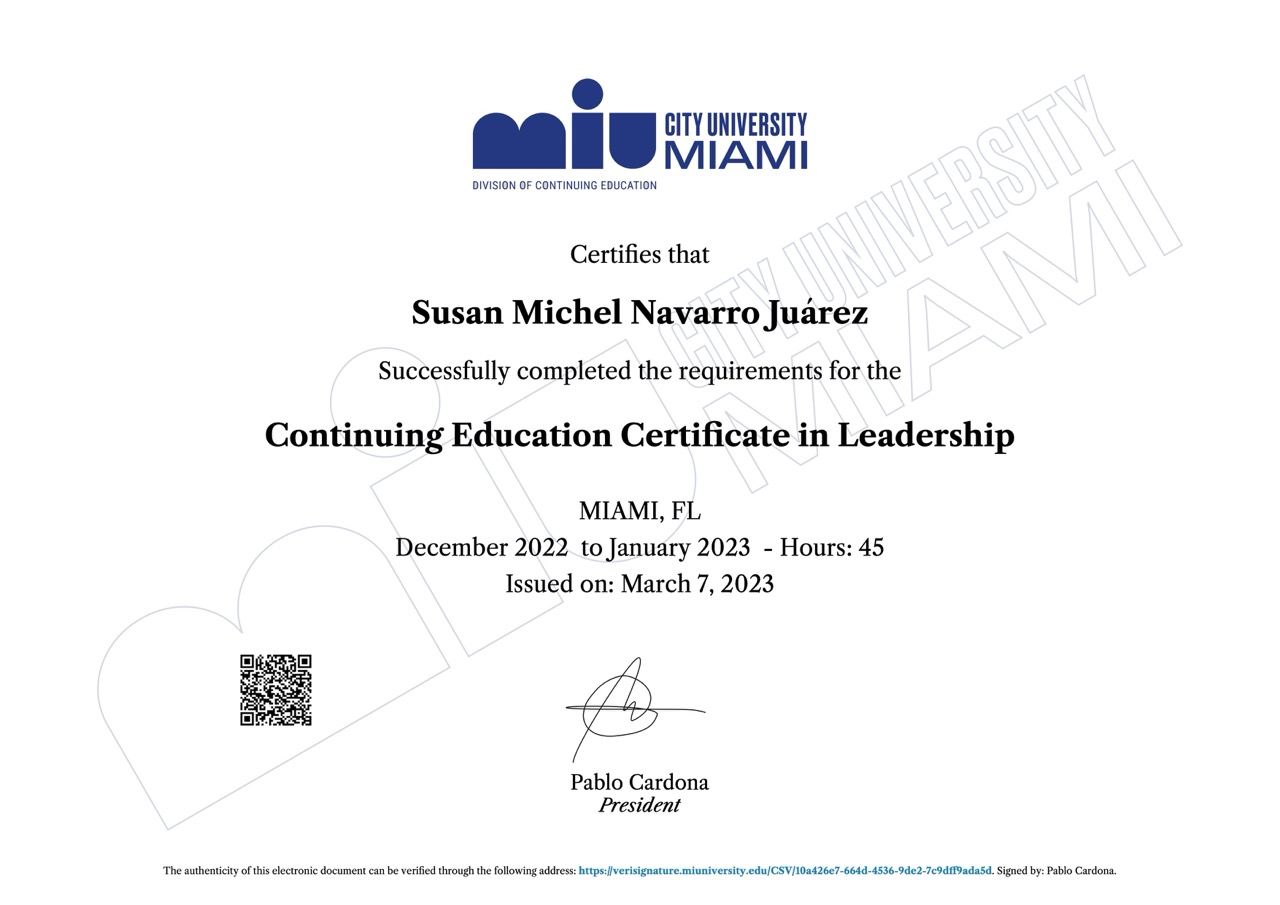 Continuing Education Certificate in Leadership: MIU - City University MIAMI (45 horas) – Emitido en Marzo 2023.
